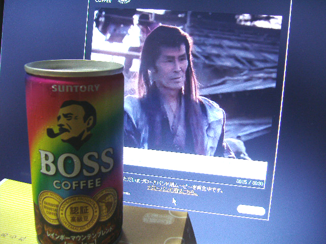 今回は、時代劇の大部屋俳優に扮する宇宙人ジョーンズ。 斬られた後のリアクションが派手すぎ、カメラの前で宇宙人の素顔がちらっと出てしまい、監督に 「やりすぎ」 と交代させられてしまう。 空気が読めないといけない……と落ち込むジョーンズに、「ガッツあるな」 と声をかけ、BOSSレインボーマウンテン・ブレンドを差し出すのが福ちゃん。 そして、2人がコーヒーを飲むシーンでCMは終わる。 長髪ストレートのかつらの福ちゃん、妙にかっこいいのだ。 斬られるシーンでアップ (ちょっとだけ、のけぞる)、ジョーンズに声をかけるところでもアップあり。 台詞だってあるんだから! いつもラス立ちで目を皿のようにして、その姿を探している私には、もう天国 (笑)。 ちなみに、斬る役で出演しているのは渡辺裕之なんだが、明らかに福ちゃんの方が目立っているあたり、ステキ。 ほんっと嬉しい~。